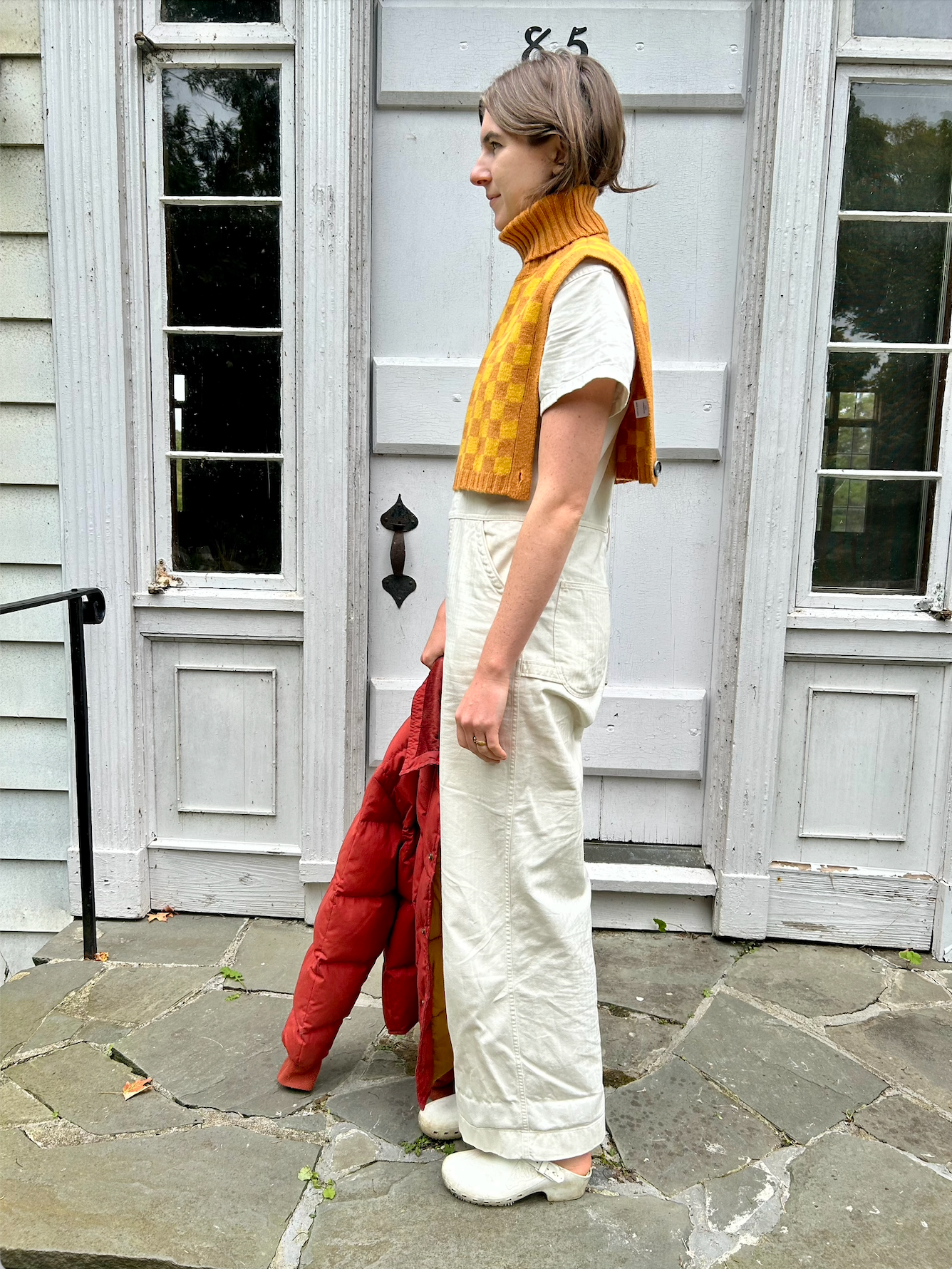High neck checker board pattern bib to keep you warm. Limited edition 100% lambswool. Imported. Designed by Janis Stemmermann, 2023.