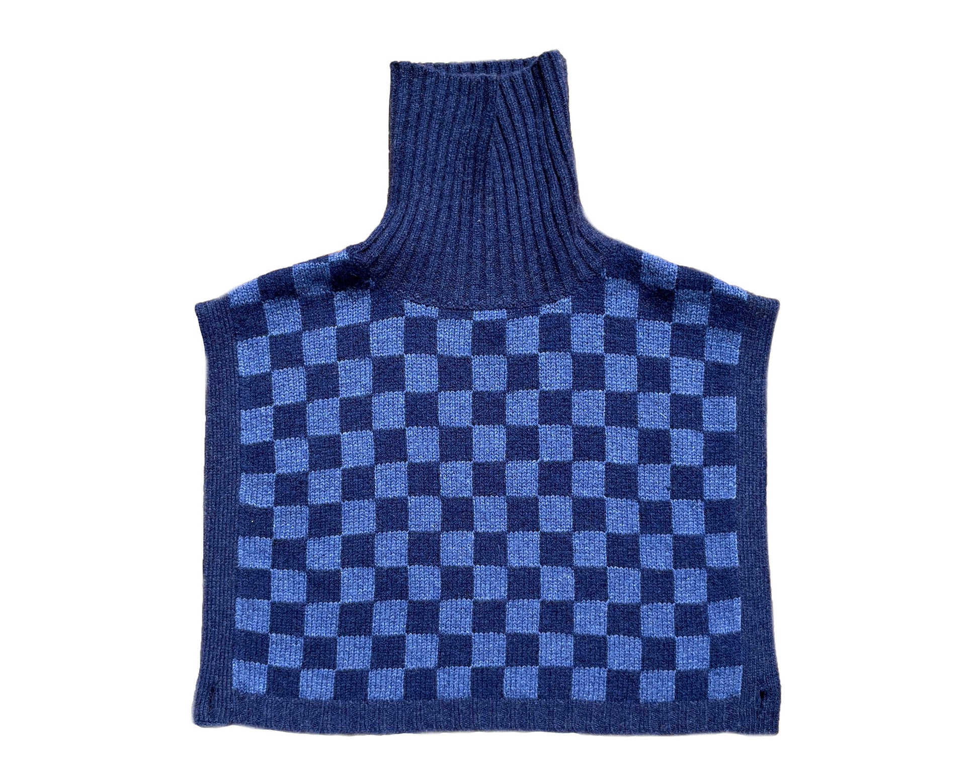 High neck checker board pattern bib to keep you warm. Limited edition 100% lambswool. Imported. Designed by Janis Stemmermann, 2023.