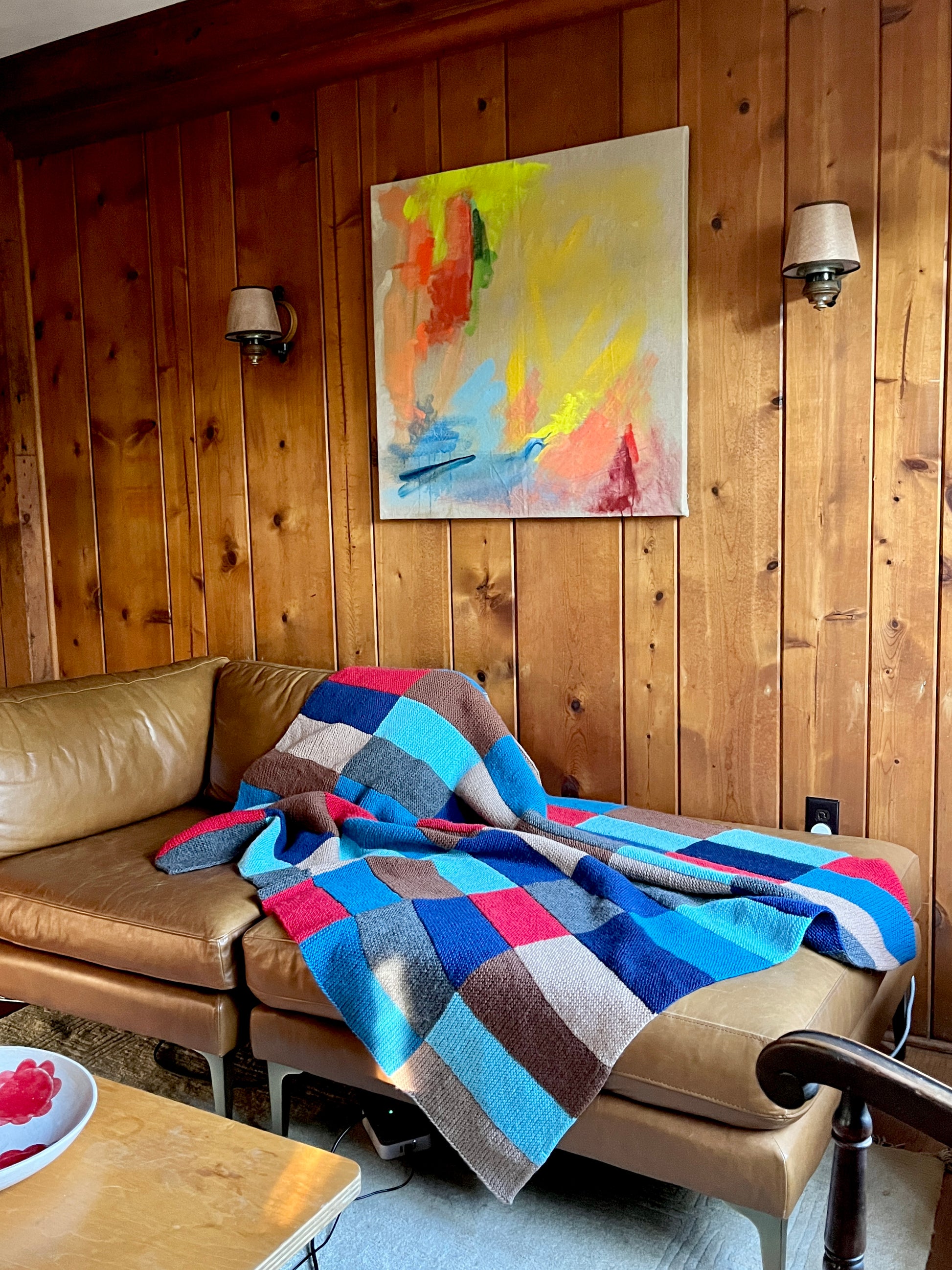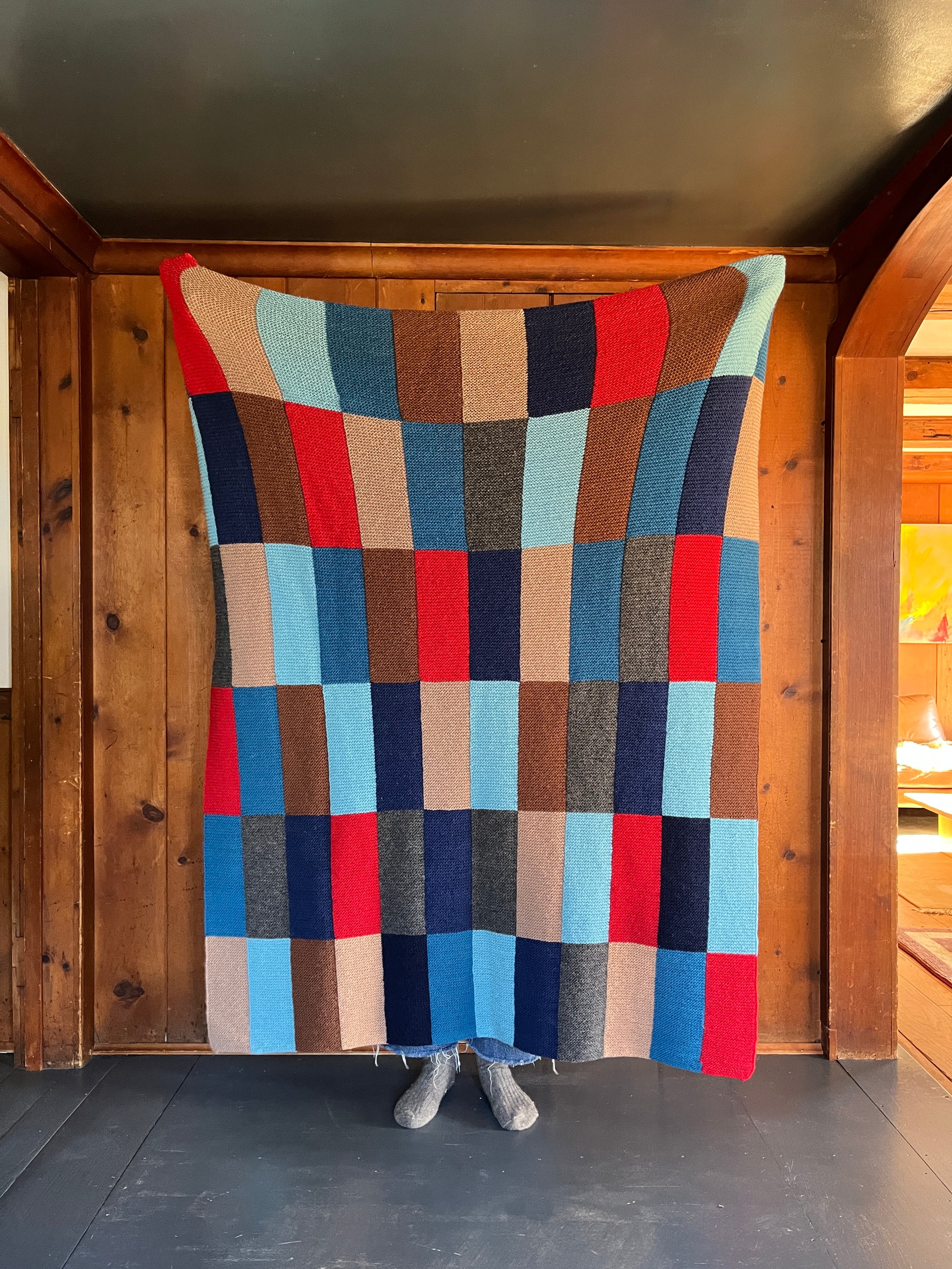 Garter stitch block pattern blanket made with leftover production yarns. Designed by Janis Stemmermann,