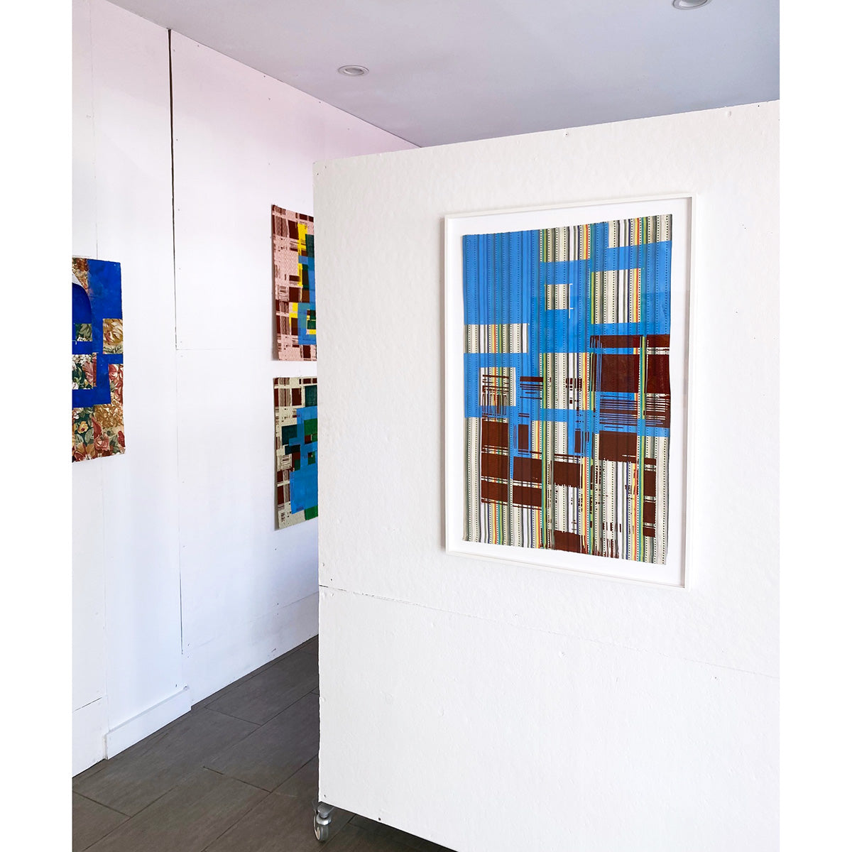 Two color woodblock print on yarn dyed textile panel (stripe position variations within edition)