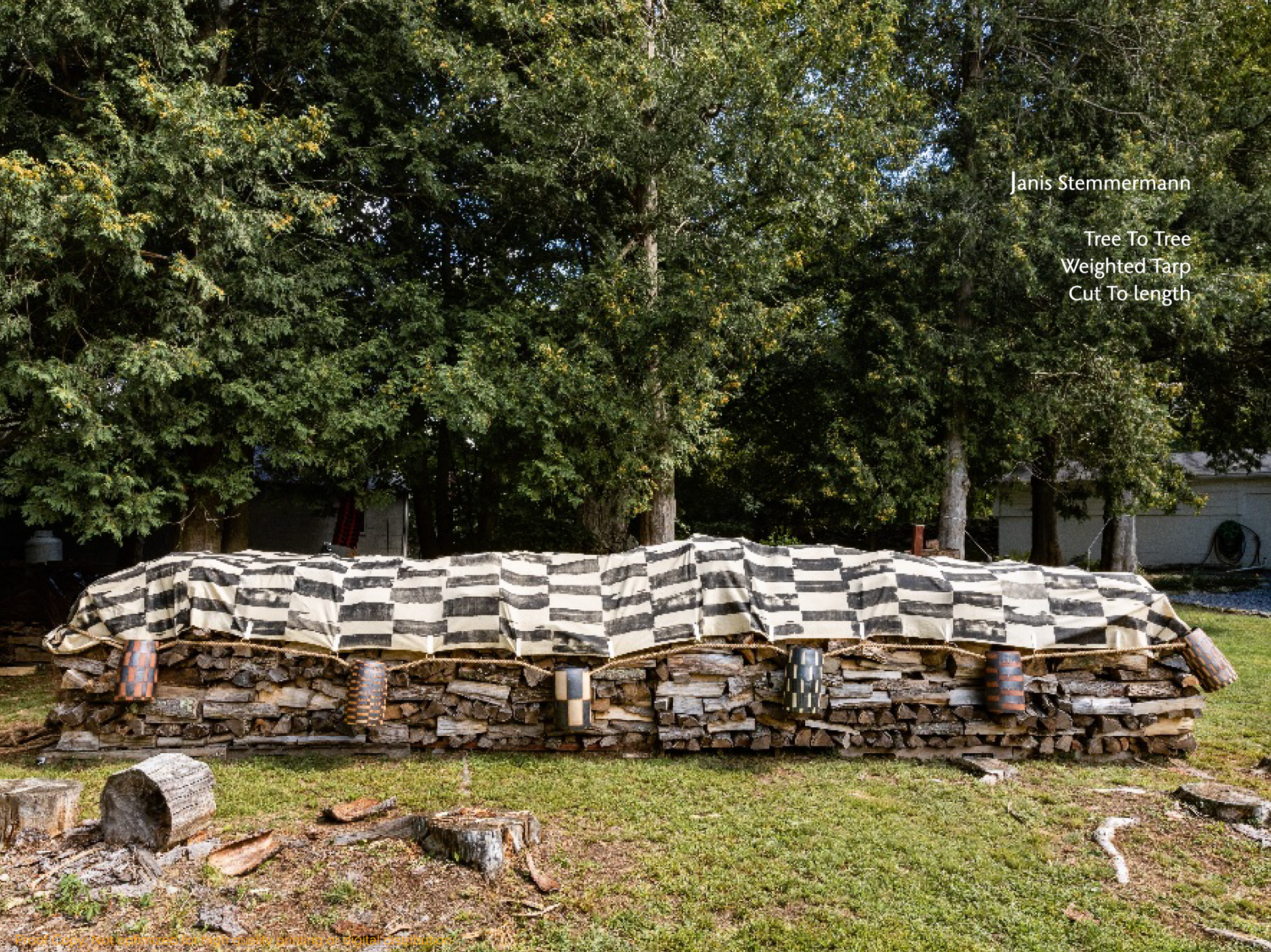 This catalog features three sculpture and print installations/exhibitions: Tree To Tree 2020, Weighted Tarp 2021-2022, Cut To Length 2023 by Janis Stemmermann. Essay by Julia Silverman
